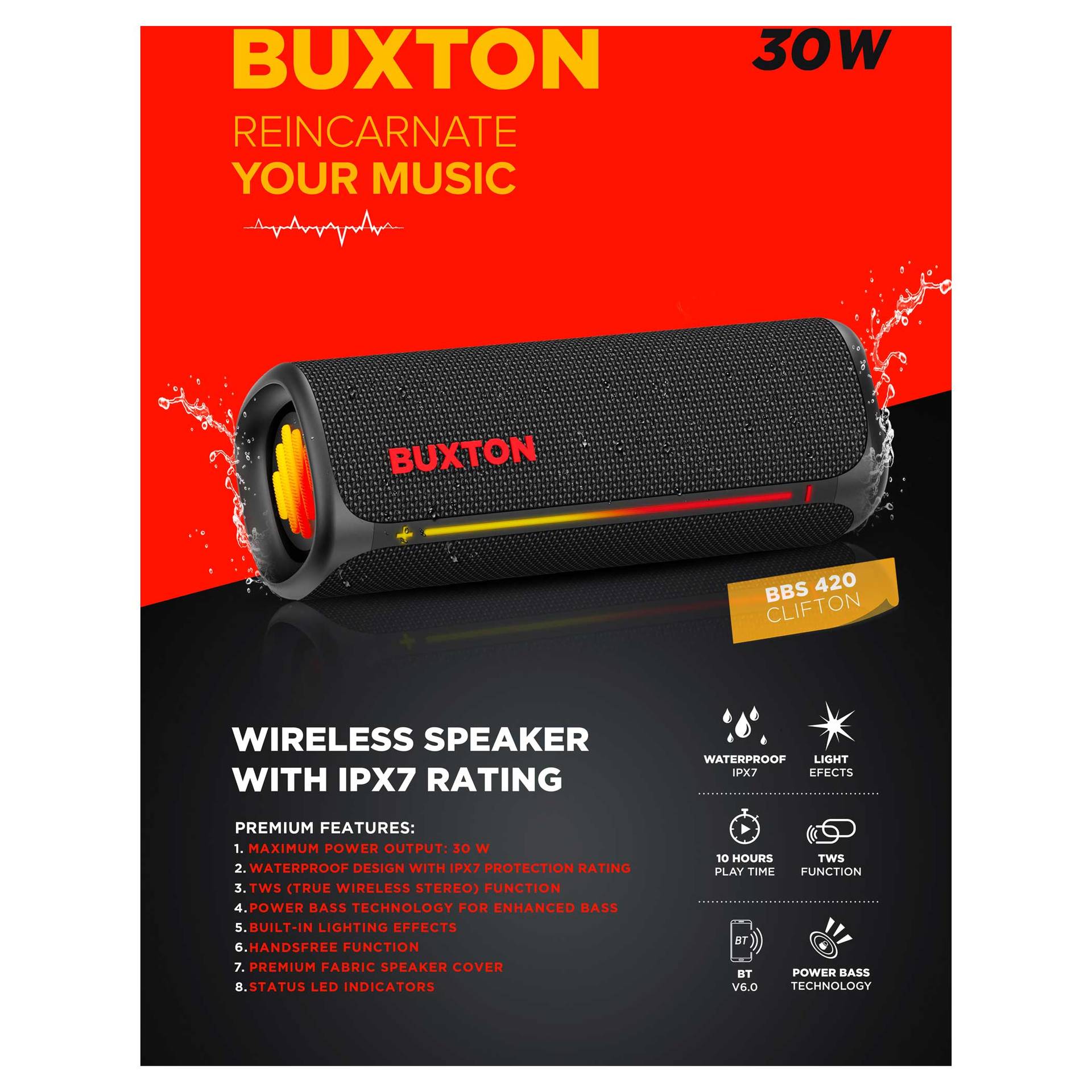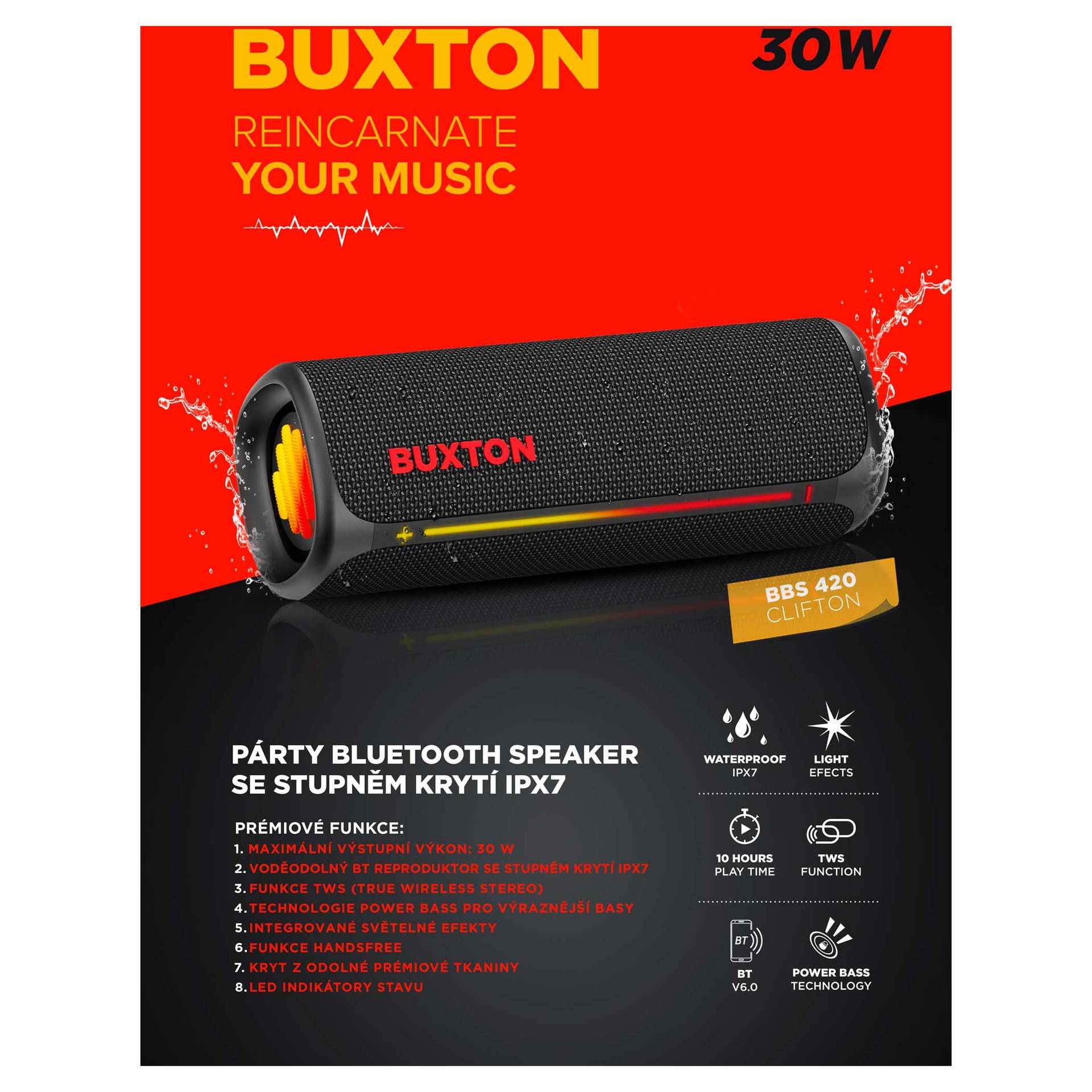 A Buxton BBS 420 CLIFTON vezeték nélküli hangszóró egyetlen kompakt eszközben ötvözi az átgondolt dizájnt, a tartósságot és az erőteljes hangzást. A 30 W hangteljesítmény, kiegészítve a Power Bass technológiával, igazi zenehallgatási élményt biztosít egy bulin, családi ünnepségen vagy akár kedvenc hangoskönyveivel való pihenés közben is. Az IPX7 víz- és nedvességállósági tanúsítványnak köszönhetően nem kell félnie kivinni a hangszórót a szabadba – az esőcseppek vagy a nedvesség nem árt neki. A textíliából készült borítás elegáns hatást kölcsönöz, a fényeffektek pedig feldobják az esti hangulatot. Az egyszerű, intuitív vezérlést LED jelzőfények egészítik ki. A beépített mikrofon lehetővé teszi a hívások kezelését anélkül, hogy a telefon után kellene nyúlnia.